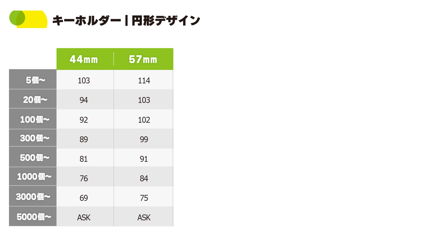 SlideLINE UP 缶バッジ缶バッジ マグネットマグネット ミラーミラー クリップクリップ キーホルダーキーホルダー ストラップストラップ スタンドスタンド 布缶バッジ布缶バッジ コンパクトミラーコンパクトミラー ホログラム(白版有り)ホログラム(白版有り) ホログラム(白版無し)ホログラム(白版無し) 和紙缶バッジ和紙缶バッジ 44mmキーホルダーLine up44mmキーホルダー44mmキーホルダーは人気のある定番商品です。 缶バッジと同じく高品質インクジェット印刷にて製造しています。 紙に印刷を行いグッズ化する製法で非常に質の高い印刷を実現しました。 ラバー素材などのキーホルダーと違い、 型を必要としない印刷ですので、小ロットでの製造が可能です。 裏面は高級感のあるメタルバックを採用いたしました。 手頃で高品質なキーホルダーをぜひご検討ください。 料金一覧を見る注文する44mm57mmキーホルダーLine up57mmキーホルダー57mmキーホルダーは人気のある定番商品です。 缶バッジと同じく高品質インクジェット印刷にて製造しています。 紙に印刷を行いグッズ化する製法で非常に質の高い印刷を実現しました。 ラバー素材などのキーホルダーと違い、 型を必要としない印刷ですので、小ロットでの製造が可能です。 裏面は高級感のあるメタルバックを採用いたしました。 手頃で高品質なキーホルダーをぜひご検討ください。 料金一覧を見る注文する57mm 料金表