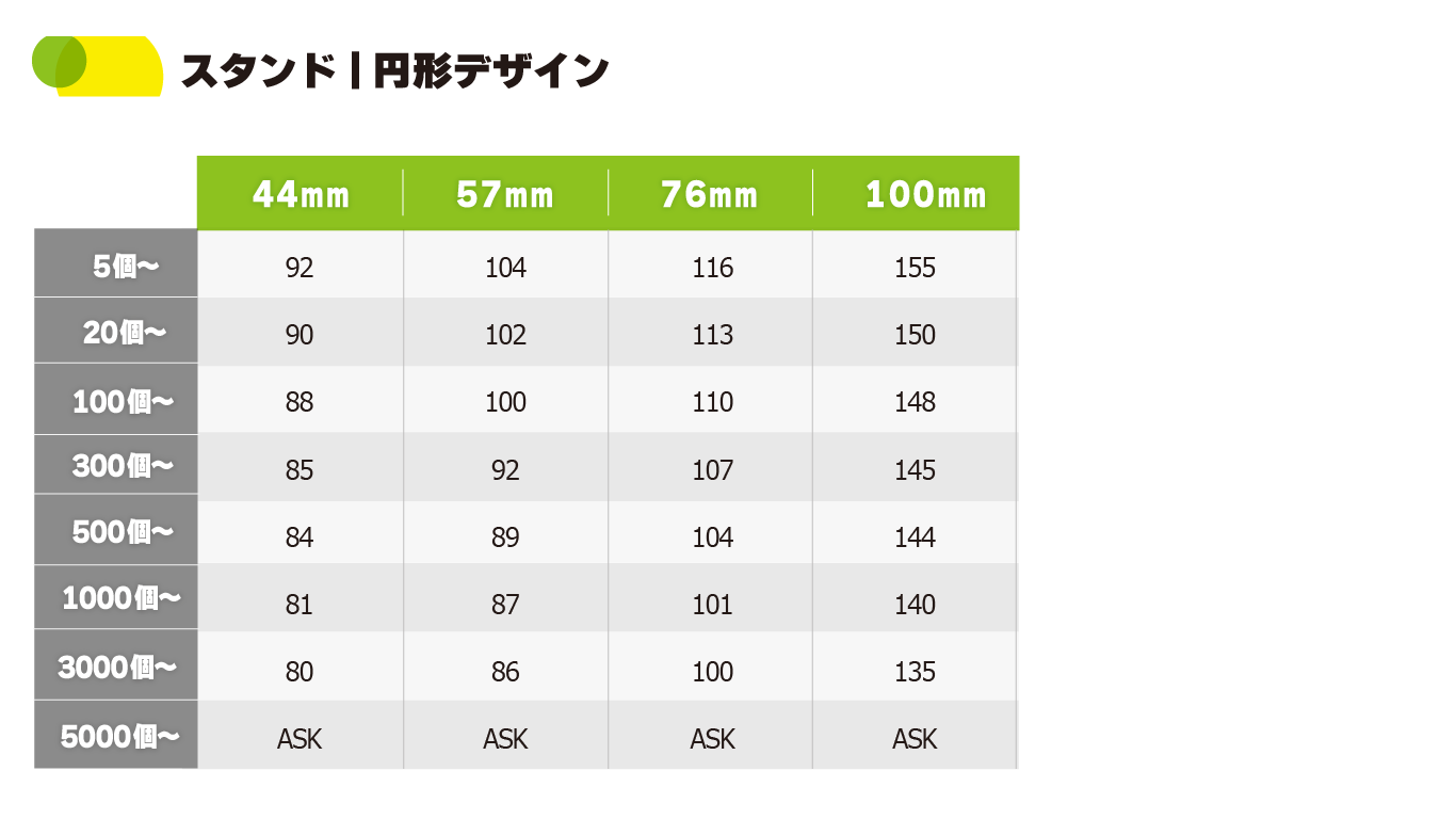 SlideLINE UP 缶バッジ缶バッジ マグネットマグネット ミラーミラー クリップクリップ キーホルダーキーホルダー ストラップストラップ スタンドスタンド 布缶バッジ布缶バッジ コンパクトミラーコンパクトミラー ホログラム(白版有り)ホログラム(白版有り) ホログラム(白版無し)ホログラム(白版無し) 和紙缶バッジ和紙缶バッジ 円形 四角形 特殊型 44mmスタンドLine up44mmスタンド44mmスタンドはディスプレイ用に開発された缶バッジです。 キャラクターやロゴを配置するだけでも かんたんにコレクションアイテムを作成することができます◎ 印刷部分は手のひらにちょうど収まるくらいのサイズ感です。 可動パーツで自立させ固定することが可能です。 料金一覧を見る注文する44mm57mmスタンドLine up57mmスタンド57mmスタンドはディスプレイ用に開発された缶バッジです。 キャラクターやロゴを配置するだけでも かんたんにコレクションアイテムを作成することができます◎ 可動パーツで自立させ固定することが可能です。 料金一覧を見る注文する57mm76mmスタンドLine up76mmスタンド76mmスタンドはディスプレイ用に開発された缶バッジです。 キャラクターやロゴを配置するだけでも かんたんにコレクションアイテムを作成することができます◎ 可動パーツで自立させ固定することが可能です。 料金一覧を見る注文する76mm100mmスタンドLine up100mmスタンド100mmスタンドはディスプレイ用に開発された缶バッジです。 キャラクターやロゴを配置するだけでも かんたんにコレクションアイテムを作成することができます◎ 可動パーツで自立させ固定することが可能です。 料金一覧を見る注文する100mm 料金表